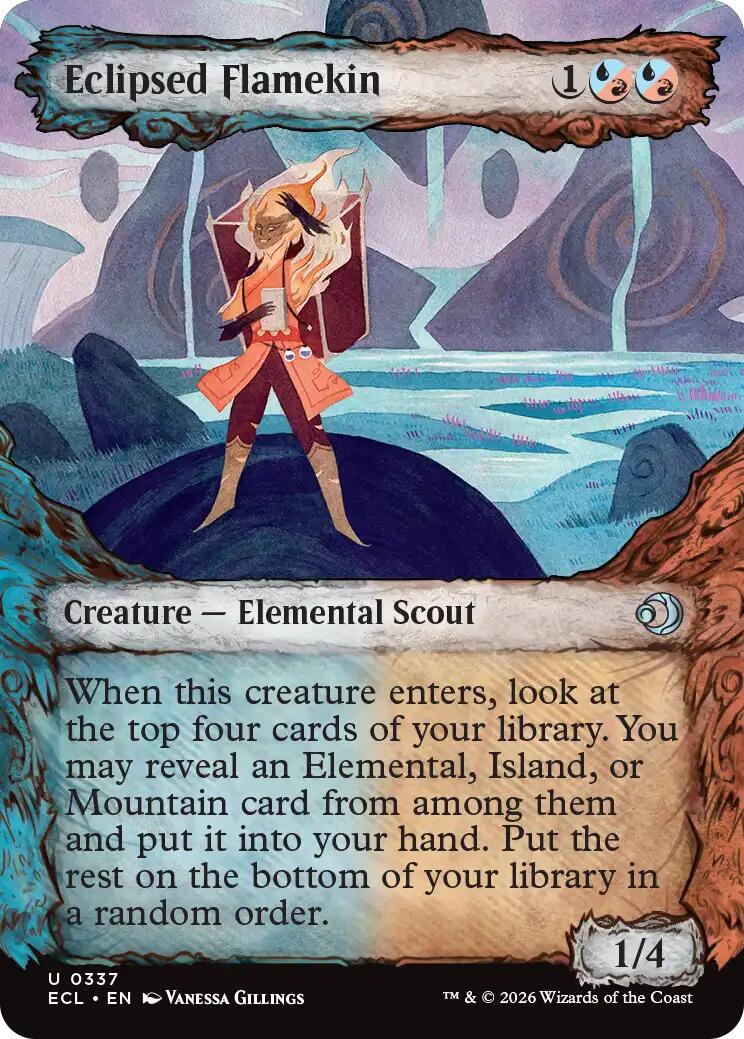 When this creature enters, look at the top four cards of your library. You may reveal an Elemental, Island, or Mountain card from among them and put it into your hand. Put the rest on the bottom of your library in a random order.