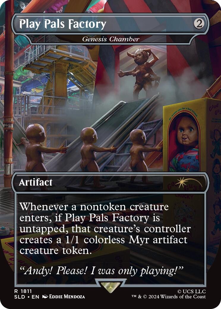 Le texte des règles contient : Chaque fois qu'une créature non jeton arrive sur le champ de bataille, si Play Pals Factory n'est pas engagée, le contrôleur de cette créature crée un jeton de créature artefact Myr incolore 1/1.