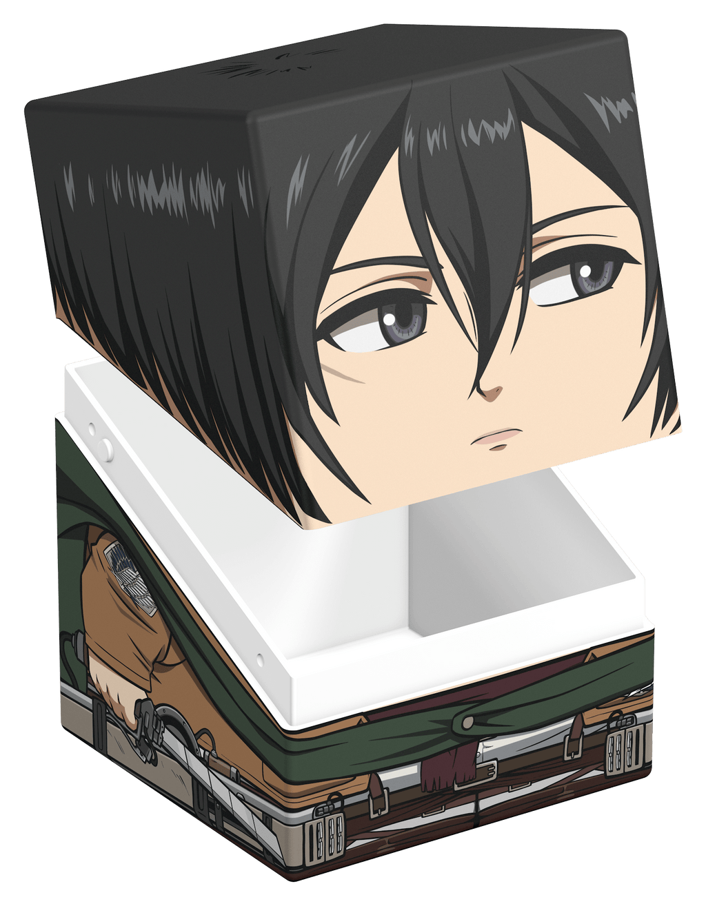 Collectible box for storing TCG decks, tabletop gaming accessories, and/or collectibles. The Eren Jäger Squaroe from the Attack on Titan edition holds up to 100 cards in double protective sleeves if used as a deck box. Squaroes are made from 78% renewable resources and fit perfectly into the separately available Collectors Case.