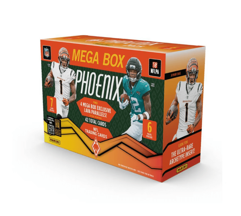 Panini presents the 2025 NFL Phoenix Football Trading Card Mega Box. Each box contains 6 packs with 7 cards per pack. Look for Mega Box Exclusive Lava Parallels. Look for Ultra-Rare Archetype Insert! Content may vary. Cards imaged are not guaranteed. Look for autographs from some of NFL's hottest players.