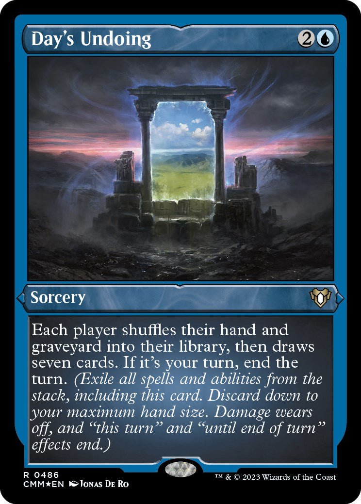 Each player shuffles their hand and graveyard into their library, then draws seven cards. If it's your turn, end the turn. (Exile all spells and abilities from the stack, including this card. Discard down to your maximum hand size. Damage wears off, and "this turn" and "until end of turn" effects end.)