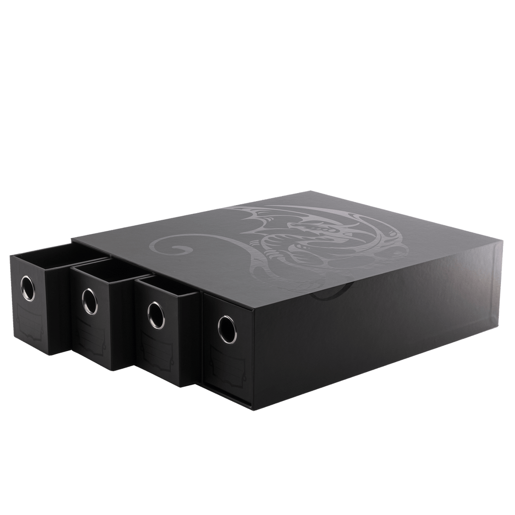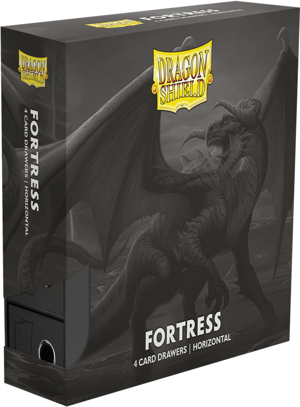 Each of the three drawers can hold 570+ single-sleeved cards, 7 Dragon Shield sleeve boxes or 20 Cube Shells. The drawers each have a foam divider that can be used to secure your collection. If you want extra dividers to organize your Fortress, you can find them here.