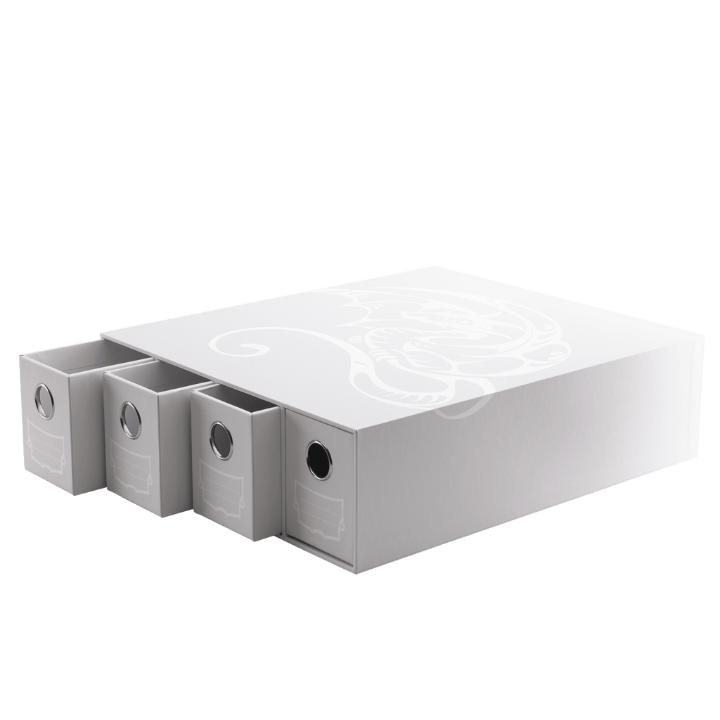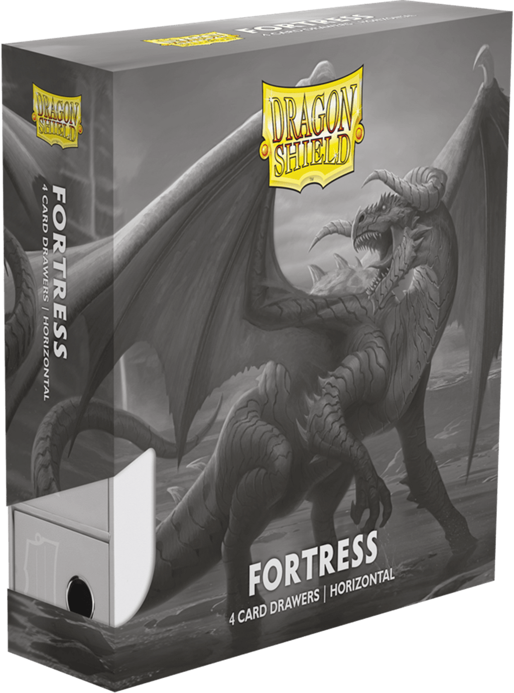 Each of the four drawers can hold 620+ single-sleeved cards, 8 Dragon Shield DS100 boxes or 25 Cube Shells. Each drawer has a foam divider that can be used to secure your collection. If you want extra dividers to organize your Fortress, you can find them here.