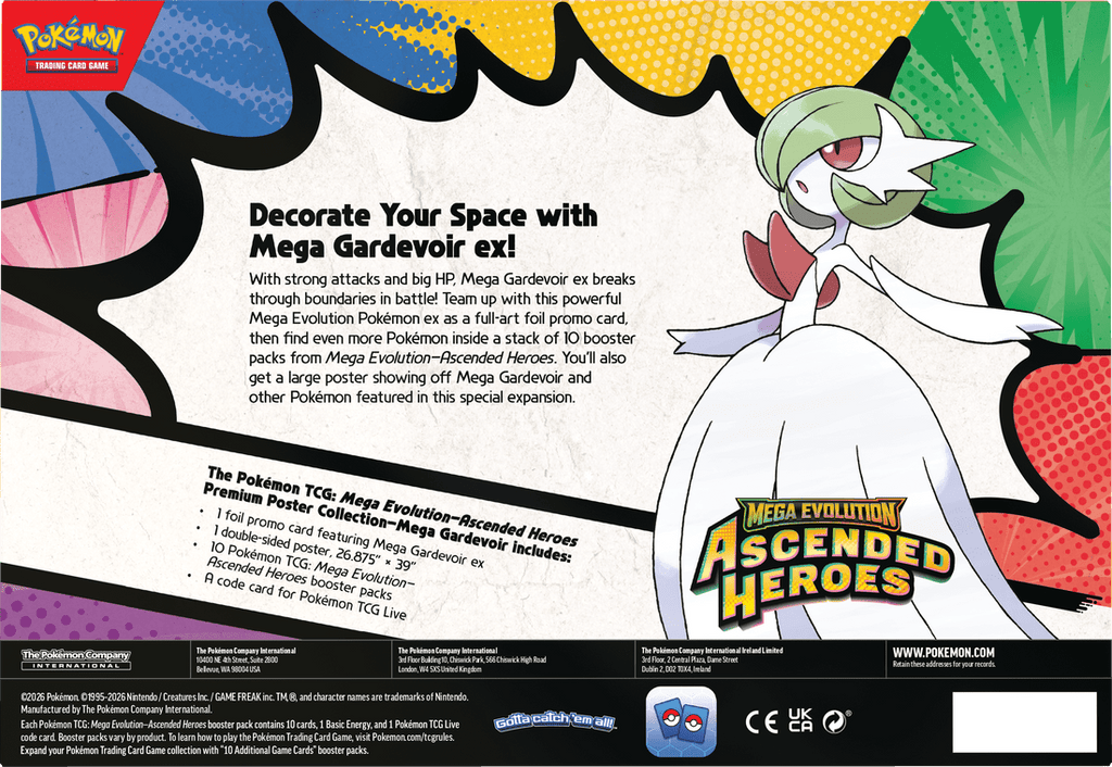 With strong attacks and big HP, Mega Lucario ex and Mega Gardevoir ex break through boundaries in battle! Team up with one of these powerful Mega Evolution Pokémon ex as a full-art foil promo card, then find even more Pokémon inside a stack of 10 booster packs from Mega Evolution—Ascended Heroes. You’ll also get a large poster showing off Mega Lucario or Mega Gardevoir and other Pokémon featured in this special expansion.