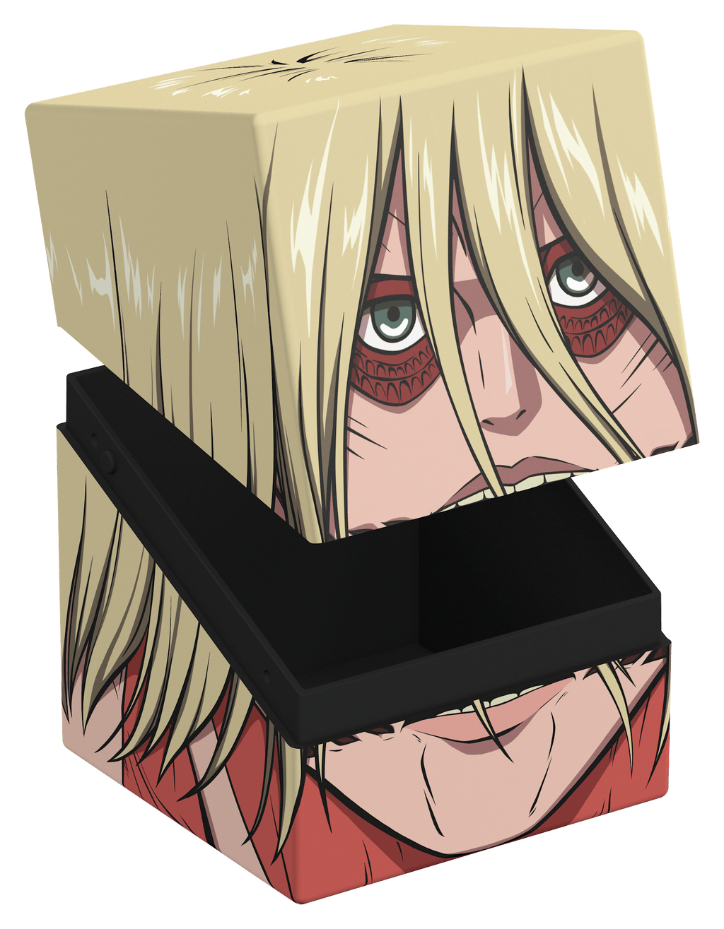 Collectible box for storing TCG decks, tabletop gaming accessories, and/or collectibles. The Eren Jäger Squaroe from the Attack on Titan edition holds up to 100 cards in double protective sleeves if used as a deck box. Squaroes are made from 78% renewable resources and fit perfectly into the separately available Collectors Case.