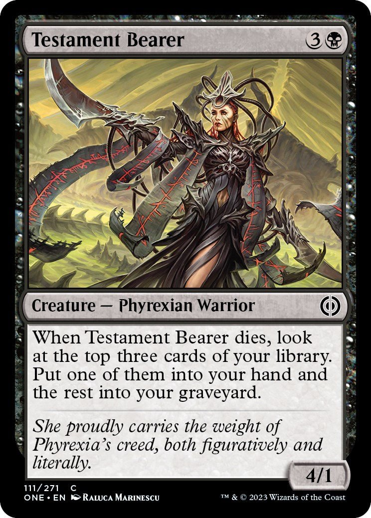 Rules Text Contains: When Testament Bearer dies, look at the top three cards of your library. Put one of them into your hand and the rest into your graveyard.