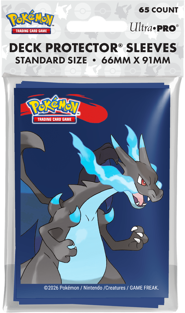 The 65ct Deck Protector® Sleeves for the Pokémon Trading Card Game feature vibrant, full-color artwork of Mega Charizard X. Ultra PRO Deck Protector® Sleeves are made with our proprietary ChromaFusion Technology® to prevent peeling. Archival-safe materials ensure you can sleeve your cards with confidence. Sized for standard size trading cards measuring 2.5 in. x 3.5 in.